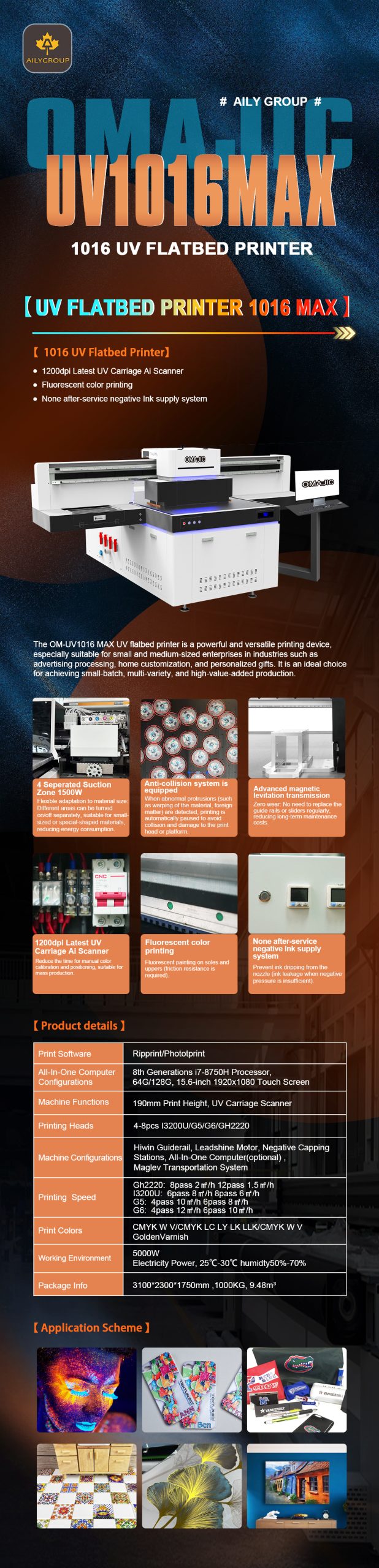 The OM-UV1016 MAX UV flatbed printer is a powerful and versatile printing device,especially suitable for small and medium-sized enterprises in industries such asadvertising processing, home customization, and personalized gifts. It is an ideal choicefor achieving small-batch,multi-variety, and high-value-added production.