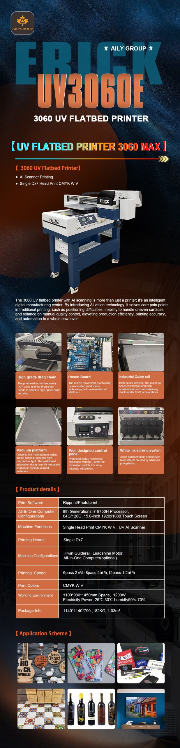The 3060 UV flatbed printer with Al scanning is more than just a printer; it’s an intelligentdigital manufacturing center.By introducing Al vision technology,it solves core pain pointsin traditional printing, such as positioning difficulties, inability to handle uneven surfaces,and reliance on manual quality control,elevating production efficiency, printing accuracy, and automation to a whole new level.